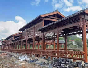 這個項目是湖北黃崗市的一個村里,定制的是一套古建小青瓦防腐木長廊,尺寸是長度11米,寬度為2.8米,總面積為30個平方米左右。陳總在網(wǎng)上找到我們